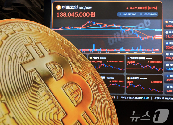 3일 서울 강남구 빗썸 라운지 전광판에 비트코인 시세가 나타나고 있다. 비트코인은 기술주 중심의 뉴욕증시 상승의 영향과 미국 연방준비제도Fed·연준가 …
