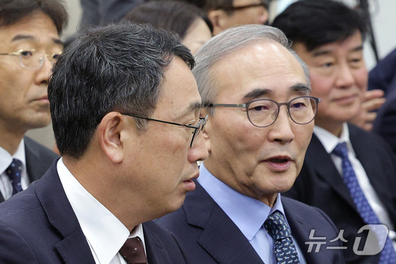 유영상 SKT 대표왼쪽와 김영섭 KT 대표가 일 서울 여의도 국회 과학기술정보방송통신위원회에서 열린 정보통신산업진흥원 등에 대한 국정감사에서 대화하…