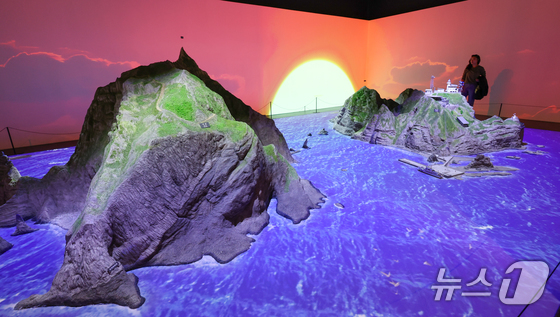 독도의 날을 하루 앞둔 지난 일 서울 영등포구 타임스퀘어에 마련된 동북아역사재단 독도체험관에 독도 모형이 전시돼 있다. ../뉴스 New…