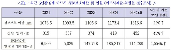 최근 년간 개 카드사 정보보호 예산 및 인원.박찬대 더불어민주당 의원 제공.카드사를 노린 해킹 시도 사례가 급증하고 있지만 정보보호 예산·인…