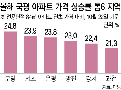 [이데일리 박지애 기자] 국평(국민평형·전용 84㎡) 아파트 매매가 기준으로 올해 가장 높은 상승세를 보인 지역은 경기도 분당구로 나타났다. 분당은 강남권과 용산을 비롯해 올해 들