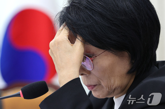 최민희 위원장이 일 서울 여의도 국회 과학기술정보방송통신위원회에서 열린 국정감사 종합감사에서 생각에 잠겨 있다. ../뉴스 News 신…