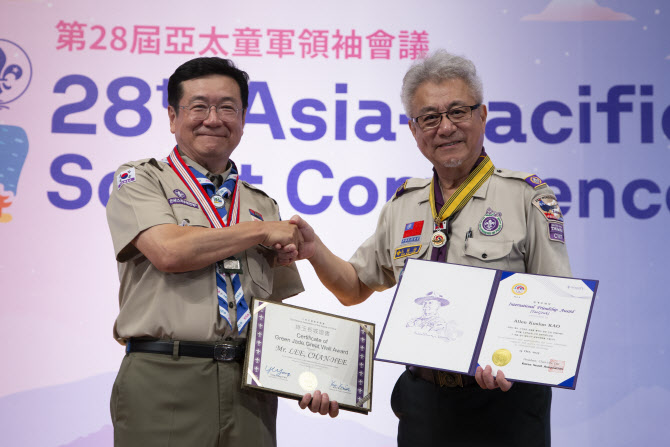 [이데일리 김영수 기자] 이찬희 한국스카우트연맹 총재가 14일 대만 카오슝에서 개최된 제28차 아시아-태평양지역스카우트총회에서 대만스카우트연맹(TGASC)으로부터 외국인에게 수여하