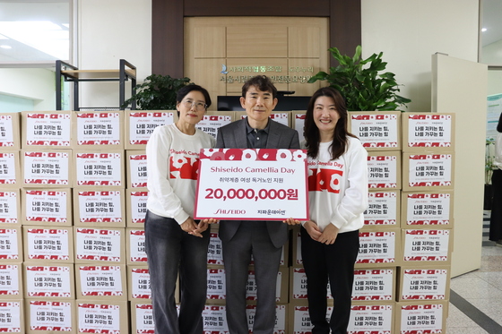 ㈜한국시세이도-지파운데이션 전달식 모습, 오른쪽부터 한국시세이도 양근혜대표, 서울시립중랑노인전문요양원 조남식원장, 한국시세이도 오경인전무 /사진=지파운데이션 제공…