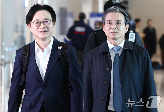 김용범 대통령실 정책실장과 김정관 산업통상자원부 장관이 지난 일 오전 인천공항 터미널에서 한미 관세협상 후속 협의를 위해 미국으로 출국하고 있다. ..…