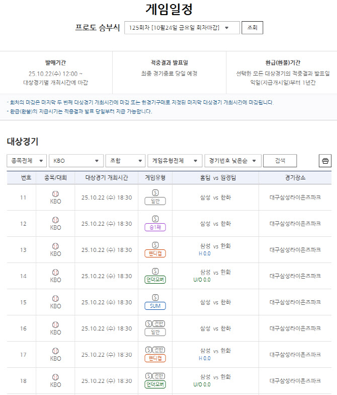 원태인 VS 정우주’ 프로토 승부식 125회차, PO 4차전 삼성-한화전 게임 마감 임박