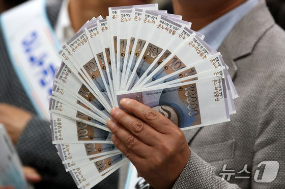일 오전 대구 중구 iM뱅크 중구청지점에서 열린 '추석맞이 전통시장 온누리상품권 구매 행사'에서 중구 관계자들이 전통시장 활성화를 위해 구매한 상품권을 펼쳐 보이고 …