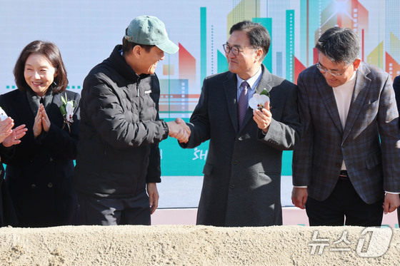 우원식 국화의장과 오세훈 서울시장이 지난 1일 오전 서울 노원구 중계본동 30-3번지 일대 백사마을에서 열린 주택재개발정비사업 기공식에서 인사 나누고 있다. 2025.1…