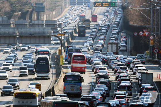 설 연휴 마지막 날인 18일 오후 서울 서초구 잠원IC 인근 경부고속도로 상행선왼쪽·하행선 방향 차량들이 서행하고 있다. 한국도로공사는 교통 혼잡이 오…