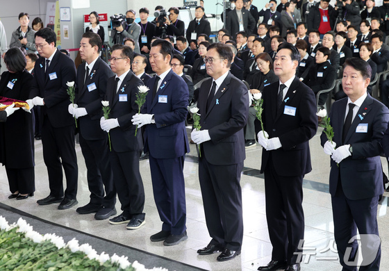 29일 오전 전남 무안국제공항에서 열린 12·29 제주항공 여객기 참사 1주기 추모식에서 우원식 국회의장을 비롯한 국회 측 참석자들이 헌화하기 위해 국화를 들고 있다. …
