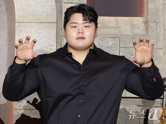 씨름선수 김민재가 일 서울 강남구 봉은사로 웨스틴 서울 파르나스에서 열린 넷플릭스 서바이벌 예능 ‘피지컬: 아시아’ 제작발표회에 참석해 포즈를 취하고있다. ‘피지컬:…