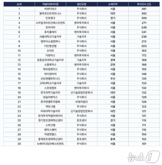 액셀러레이터 누적2017~2025년 상반기 투자 건수 랭킹 TOP 302025 액셀러레이터 산업백서 2025 상반기 갈무리초기…