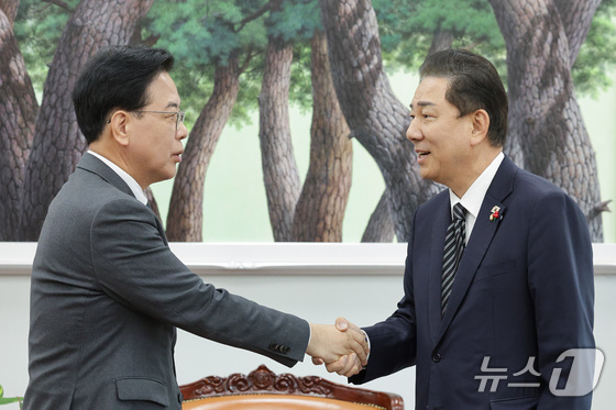 김병기 더불어민주당 원내대표와 송언석 국민의힘 원내대표가 1일 서울 여의도 국회에서 회동하고 있다. 2025.12.1/뉴스1 News1 신웅수 기자여…
