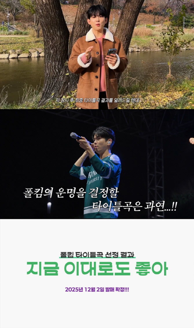 [이데일리 스타in 김현식 기자] 가수 폴킴의 새 앨범 타이틀곡이 대중의 손으로 결정됐다. 27일 소속사 와이예스엔터테인먼트에 따르면 폴킴은 12월 2일 발매할 새 앨범 타이틀곡을