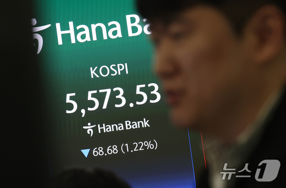 26일 서울 중구 하나은행 딜링룸 전광판에 코스피 시황이 표시되고 있다. 이날 코스피는 전 거래일 대비 0.85% 하락한 5594.06으로 출발했다. 2026.3.26 …