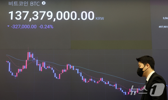 18일 서울 강남구 업비트 라운지 전광판에 비트코인 가격이 1억3천7백만원대를 보이고 있다. 2025.11.18/뉴스1 News1 김명섭 기자국내 가…