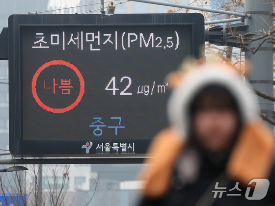 초미세먼지 농도가 '나쁨' 단계를 보인 11일 오전 서울 중구 시청역 앞에 설치된 전광판에 대기질 농도가 표시되고 있다. 2026.2.11 뉴스1 황기선 기…