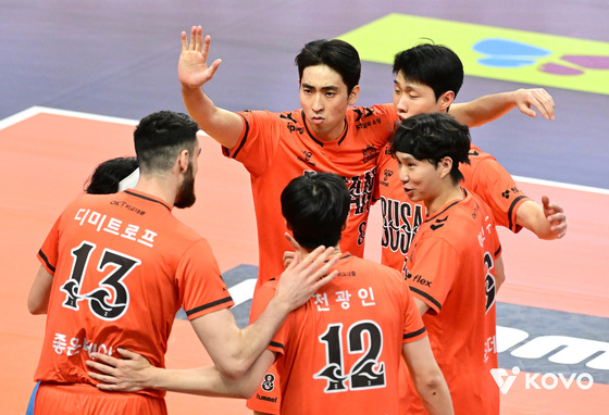 기뻐하는 OK저축은행 선수들. KOVO 제공프로배구 OK저축은행이 풀세트 접전 끝에 우리카드를 잡고 3위로 도약했다.OK저축은행은 17일 부산 …