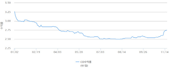 [이데일리 유준하 기자] 시중은행이 발행하는 양도성예금증서(CD) 91일물 금리가 크레딧 시장 약세로 상승세를 보인다. 기준금리를 훨씬 웃도는 양도성예금증서 금리에 대해 시장에선