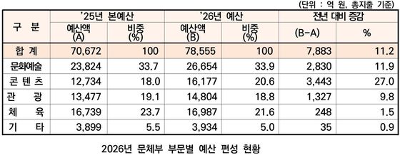 2026년 문체부 부문별 예산 편성 현황문화체육관광부 2026년 예산이 7조 8555억 원으로 확정됐다고 3일 밝혔다. 올해 본예산 대비 7883억 원 증가한 1…