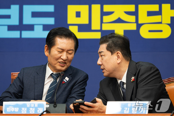 정청래 더불어민주당 대표와 김병기 원내대표가 서울 여의도 국회에서 열린 최고위원회의에서 대화하고 있다. 2025.12.15/뉴스1 News1 유승관 기자…