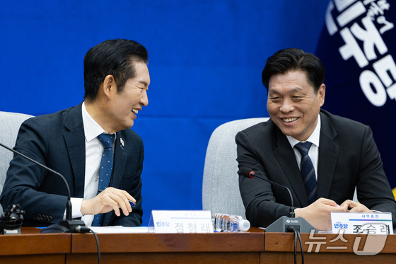 정청래 더불어민주당 대표가 서울 여의도 국회에서 열린 전국기초의회의원협의회·전국광역의회의원협의회와의 간담회에서 조승래 사무총장과 대화하고 있다. 2025.11.18/뉴스…