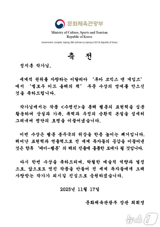 최휘영 장관 축전문화체육관광부가 만화계의 오스카상이라 불리는 이탈리아 '루카 코믹스 앤 게임즈'에서 '옐로우 키드 올해의 책'을 수상한 정지훈 작가에게 "웹툰 종…