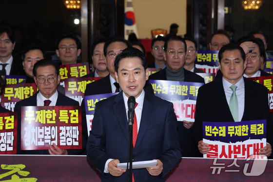 장동혁 국민의힘 대표가 15일 서울 여의도 국회 로텐더홀에서 더불어민주당의 특검 추진에 반대하고 있다. 2026.1.15/뉴스1 News1 신웅수 기자…