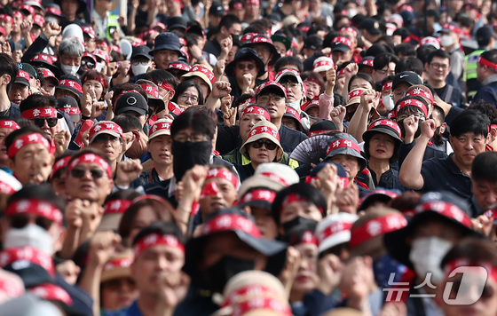민주노총 공공운수노조 인천공항지역지부 회원들이 일 인천국제공항 제여객터미널에서 열린 전면파업 일차 총파업 결의대회에서 구호를 외치고 있다. ../뉴스…