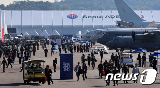 년 월 일 경기도 성남시 서울공항에서 개막한 ' 서울 항공우주방위산업전시회ADEX'에서 참관객들이 전시된 항공기들을 살펴보는 모습…