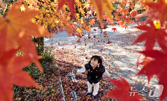 온화한 가을 날씨를 보인 30일 전북 전주시 전주동물원을 찾은 한 어린이가 낙엽을 던지며 즐거운 시간을 보내고 있다. 2025.11.30/뉴스1 News1 …
