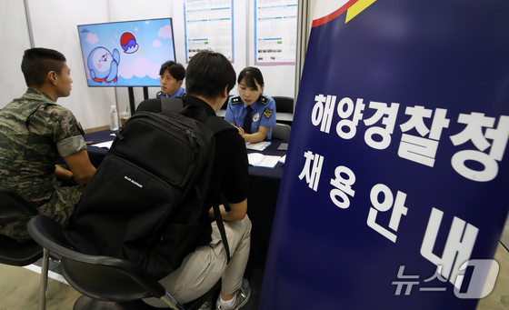 일 부산 해운대구 벡스코 제전시장에서 열린 ' 해양수산 취업박람회'에서 구직자들이 해양경찰청 채용 상담을 받고 있다. ../뉴스 Ne…