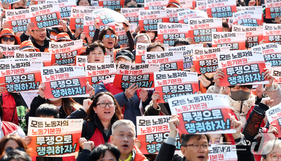 민주노총 조합원들이 10일 서울 종로구 세종대로 일대에서 열린 민주노총 투쟁 선포대회에서 구호를 외치고 있다. 2026.3.10 뉴스1 최지환 기자노…
