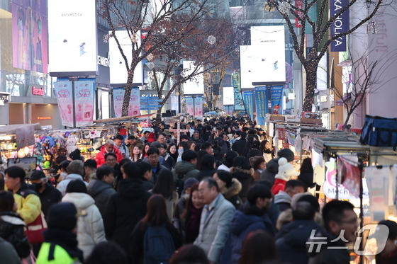 크리스마스 이브인 24일 오후 서울 중구 명동거리가 성탄절 분위기를 만끽하려는 시민과 관광객들로 북적이고 있다. 2025.12.24/뉴스1 News1 황기선…