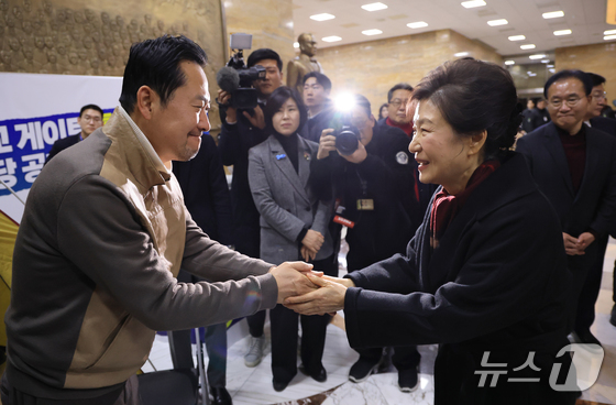 박근혜 전 대통령이 22일 서울 여의도 국회 로텐더홀에서 쌍특검통일교·민주당 공천 뇌물 특검을 요구하며 8일째 단식 중인 장동혁 국민의힘 대표와 인사…