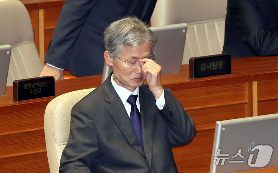 조희대 대법원장이 4일 오전 서울 여의도 국회 본회의장에서 안경을 고쳐쓰고 있다. 2025.11.4/뉴스1 News1 국회사진기자단더불어민주당은 22…