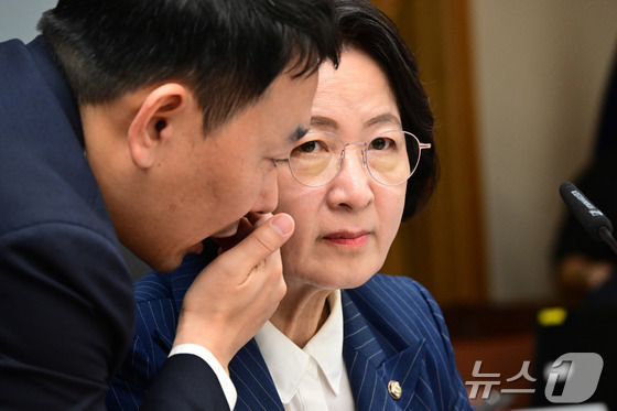 추미애 국회 법제사법위원장이 일 오전 서울 서초구 대법원에서 열린 전체회의에서 김용민 더불어민주당 의원과 귀엣말을 하고 있다. ../뉴스 …