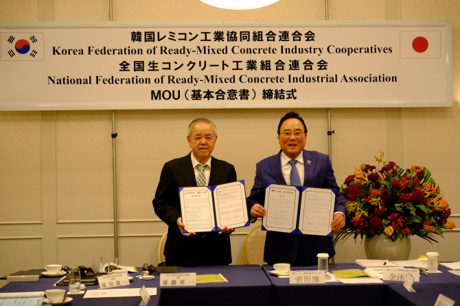 [도쿄(일본)=이데일리 김영환 기자] 한국레미콘공업협동조합연합회와 일본전국생콘크리트공업조합연합회는 24일 일본 도쿄 다이이치 호텔에서 ‘양국 레미콘 산업 발전을 위한 업무협약’(M
