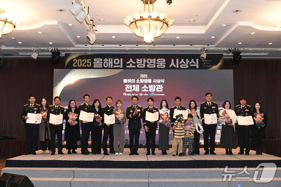김승룡 소방청장 직무대행이 제19회 영웅소방관 시상식에서 수상한 소방공무원 및 가족들과 기념사진을 촬영하고 있다.소방청 제공소방청은 11일 에쓰…