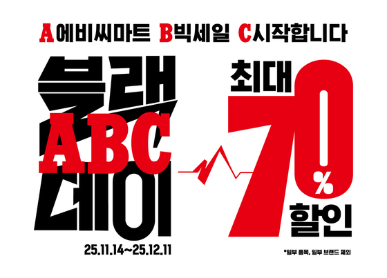 ABC마트는 블랙프라이데이 시즌을 맞아 14일부터 12월 11일까지 최대 70% 할인 혜택의 연중 최대 규모 할인 행사 '블랙ABC데이'를 실시한다.ABC마트제…