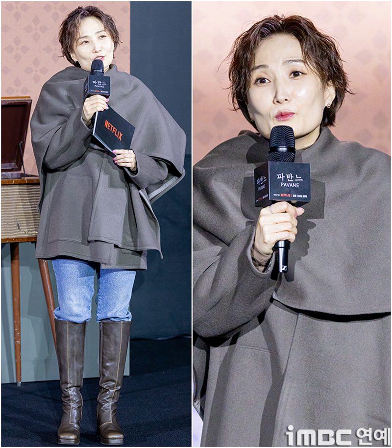 MC 박경림이 12일 오전 서울 강남구 메가박스 코엑스점에서 열린 넷플릭스 영화 ‘파반느’ 제작보고회에 참석해 진행을 하고 있다. ‘파반느’는 마음의 문을 닫고 살아가던 세 사람이