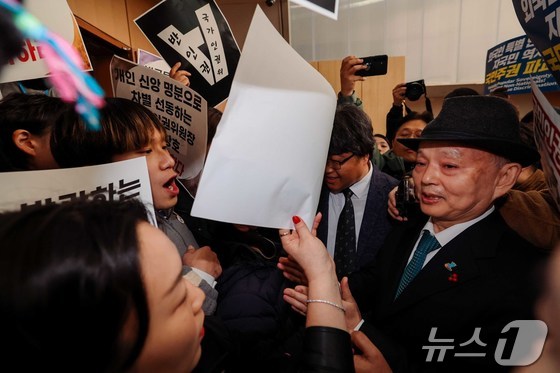 10일 서울 중구 안중근 의사 기념관에서 열린 인권의날 기념행사에 참석하던 안창호 국가인권위원회 위원장이 국가인권위원회 바로잡기 공동행동에 가로막혀 있다. 공동…
