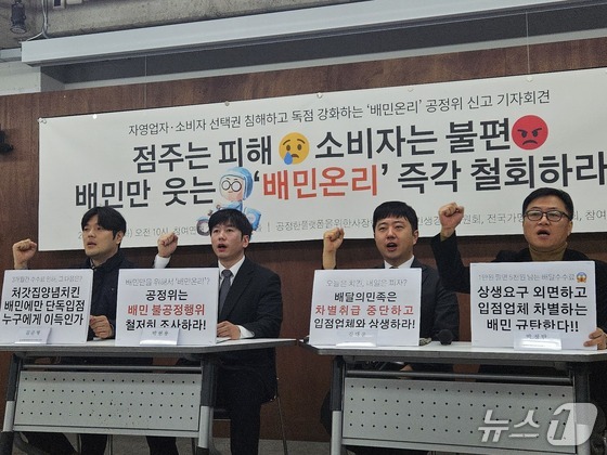 공정한플랫폼을위한사장협회, 전국가맹점주협의회, 민주사회를위한변호사모임민변, 참여연대 등 단체 관계자들이 24일 오전 서울 종로구 참여연대 아름드리홀에서…