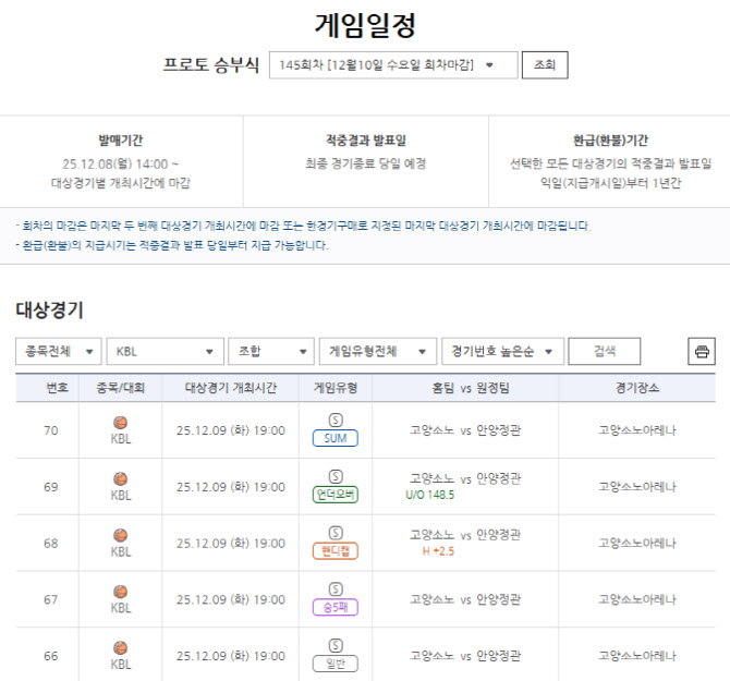 주중 KBL 경기 대상 프로토 승부식 145회차, 게임 마감 임박