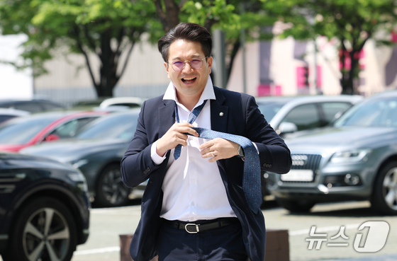 전용기 더불어민주당 의원이 방송 녹화를 위해 지난 5월 7일 서울 양천구 SBS 방송센터에 도착해 넥타이를 매며 스튜디오로 이동하고 있다. 2025.5.7/뉴스1 &co…