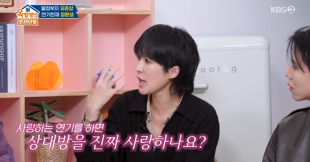 방송인 홍진경이 애정 신에 대해 궁금한 모습을 보였다. 11월 20일 방송된 KBS 2TV 예능 ‘옥탑방의 문제아들’에서는 뮤지컬 ‘비하인드 더 문’에서 열연 중인 배우 유준상,