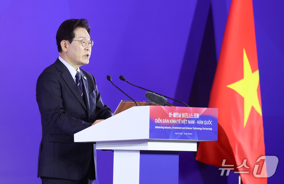 베트남을 국빈 방문 중인 이재명 대통령이 23일현지시간 하노이의 한 호텔에서 열린 한-베트남 비즈니스 포럼에서 발언하고 있다. 2026.4.23 &co…