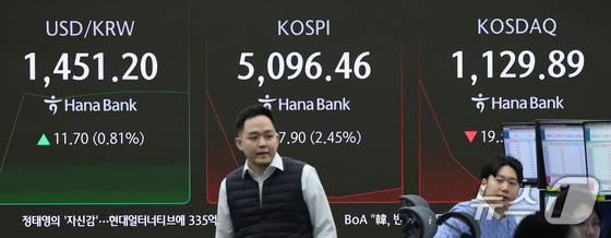 코스피가 하락 출발한 2일 서울 중구 하나은행 본점 딜링룸 전광판에 장초반 시황이 나타나고 있다. 2026.2.2/뉴스1 News1 박지혜 기자도널드…