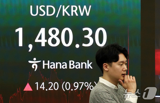 중동분쟁 여파로 환율이 급등하고 있는 4일 서울 중구 하나은행 본점 딜링룸 전광판에 원달러 환율이 표시되어 있다. 2026.3.4 뉴스1 최지환 기자…