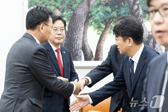 송언석 국민의힘 원내대표가 10일 서울 여의도 국회에서 김병기 더불어민주당 원내대표, 문진석 원내수석과 비공개 회동을 하고 있다. 2025.12.10/뉴스1 …